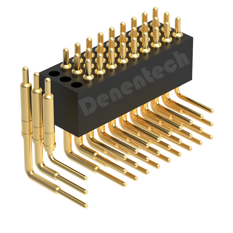 Denentech 工厂定制 1.27MM弹簧针H4.0双排公座90度帯柱智能穿戴pogopin镀金顶针